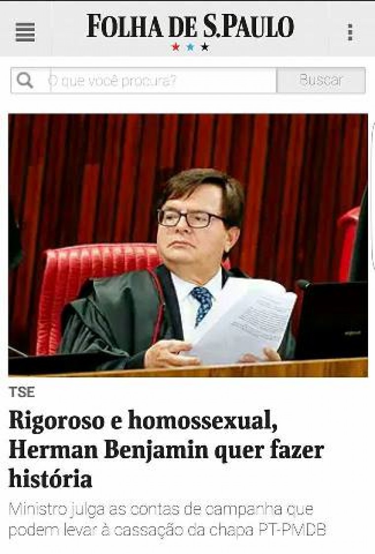 Neste domingo o jornal conseguiu se superar ao revelar a nação que o ministro Herman Benjamin do Tribunal Superior Eleitoral (TSE), relator do processo que pode cassar a chapa Dilma/Temer nas eleições de 2014, é ‘rigoroso e homossexual assumido’.